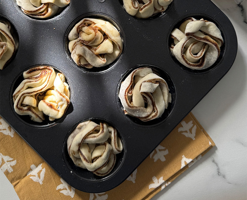 - משמנים תבנית של 12 שקעים בחמאה מומסת ומניחים את רצועות הבצק בשקעים בצורה מבולגנת ורופפת.