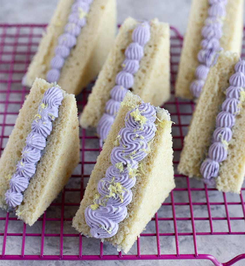 - להרכבת העוגה: לאחר התקררות מלאה, בעזרת סכין ארוכה ומשוננת, חותכים את העוגה באמצע, לשני חלקים שווים. מורחים את הקרם בשכבה אחידה על צד אחד בלבד ומניחים מעל את החצי השני. בשלב זה מומלץ להעביר לקירור למשך שעה ואז לחתוך את העוגה. מתחילים עם יישור בצדדים ולאחר מכן חותכים לריבועים בגודל 7X7ס״מ ואז למשולשים. ניתן לזלף קישוט עם דופן העוגה עם הקרם הנותר
